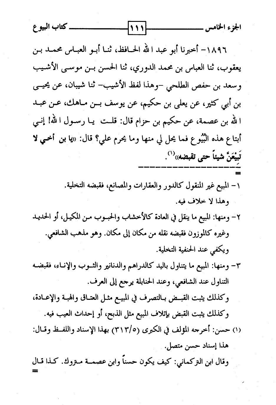 1896 - أخبرنا أبو عبد الله الحافظ ، ثنا أبو العباس محمد بن يعقوب ، ثنا العباس بن محمد الدوري ، ثنا الحسن بن موسى الأشيب وسعد بن حفص الطلحي - وهذا لفظ الأشيب - ثنا شيبان ، عن يحيى بن أبي كثير ، عن يعلى بن حكيم ، عن يوسف بن ماهك ، عن عبد الله بن عصمة ، عن حكيم بن حزام قال : قلت يا رسول الله ! إني أبتاع هذه البيوع فما يحل لي منها وما يحرم علي ؟ قال : ' يا بن أخي لا تبيعن شيئاً حتى تقبضه ' ( 1 ) .