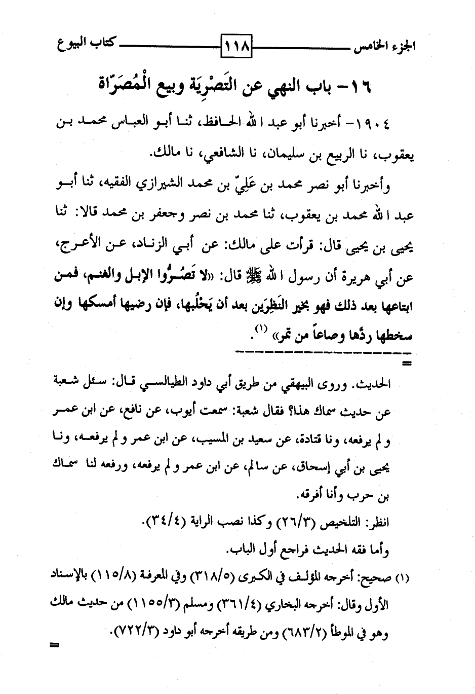 1904 - أخبرنا أبو عبد الله الحافظ ، ثنا أبو العباس محمد بن يعقوب ، نا الربيع بن سليمان ، نا الشافعي ، نا مالك . وأخبرنا أبو نصر محمد بن علي بن محمد الشيرازي الفقيه ، ثنا أبو عبد الله محمد بن يعقوب ، ثنا محمد بن نصر وجعفر بن محمد قالا : ثنا يحيى بن يحيى قال : قرأت على مالك : عن أبي الزناد ، عن الأعرج ، عن أبي هريرة أن رسول الله [ صلى الله عليه وسلم ] : ' قال : لا تصروا الإبل والغنم ، فمن ابتاعها بعد ذلك فهو بخير النظرين بعد أن يحلبها ، فإن رضيها أمسكها وإن سخطها ردها وصاعاً من تمر ' ( 1 ) .