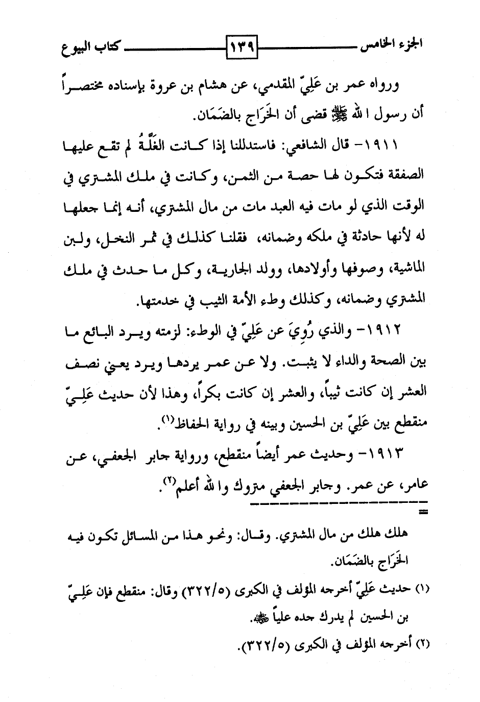 1911 - قال الشافعي : فاستدللنا إذا كانت الغلة لم تقع عليها الصفقة فتكون لها حصة من الثمن ، وكانت في ملك المشتري في الوقت الذي لو مات فيه العبد مات من مال المشتري ، أنه إنما جعلها له لأنها حادثة في ملكه وضمانه ، فقلنا كذلك في ثمر النخل ، ولبن الماشية وصوفها وأولادها ، وولد الجارية ، وكل ما حدث في ملك المشتري وضمانه ، وكذلك وطء الأمة الثيب في خدمتها .