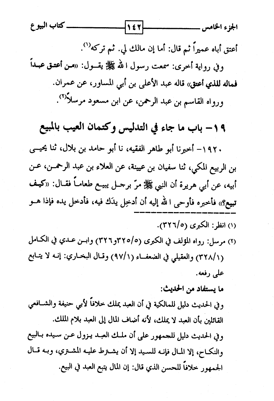 أعتق أباه عميراً ثم قال : أما إن مالك لي . ثم تركه ( 1 ) . وفي رواية أخرى : سمعت رسول الله [ صلى الله عليه وسلم ] يقول : ' من أعتق عبداً فماله للذي أعتق ' قاله عبد الأعلى بن أبي المساور ، عن عمران . ورواه القاسم بن عبد الرحمن ، عن ابن مسعود مرسلاً ( 2 ) . 19 - باب ما جاء في التدليس وكتمان العيب بالمبيع