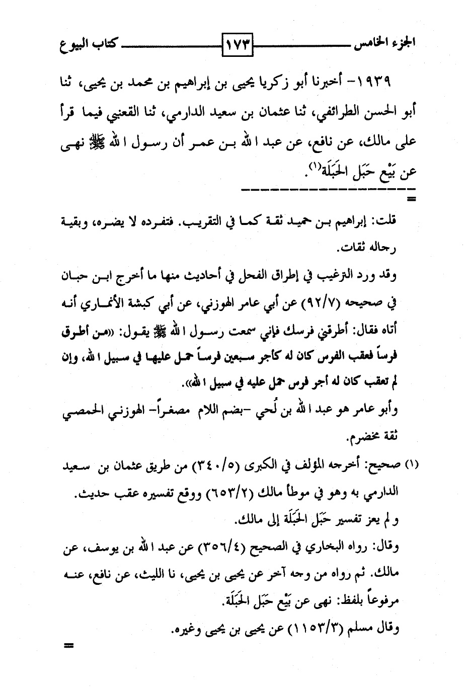 1939 - أخبرنا أبو زكريا يحيى بن إبراهيم بن محمد بن يحيى ، ثنا أبو الحسن الطرائفي ، ثنا عثمان بن سعيد الدارمي ، ثنا القعنبي فيما قرأ على مالك ، عن نافع ، عن عبد الله بن عمر أن رسول الله [ صلى الله عليه وسلم ] نهى عن بيع حبل الحبلة ( 1 ) .