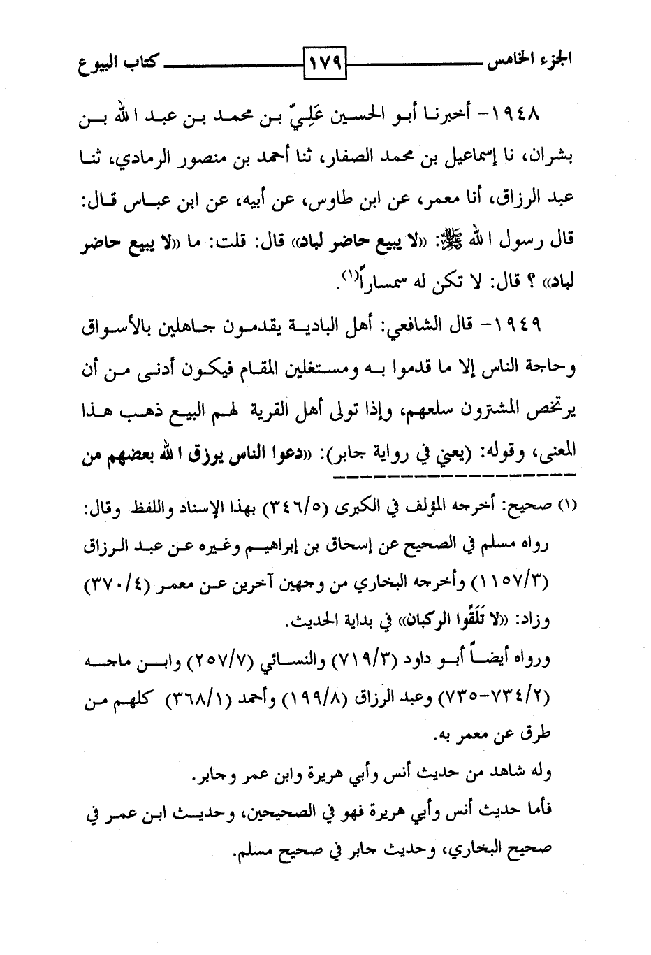 1948 - أخبرنا أبو الحسين علي بن محمد بن عبد الله بن بشران ، نا إسماعيل بن محمد الصفار ، ثنا أحمد بن منصور الرمادي ، ثنا عبد الرزاق ، أنا معمر ، عن ابن طاوس ، عن أبيه ، عن ابن عباس قال : قال رسول الله [ صلى الله عليه وسلم ] : ' لا يبيع حاضر لباد ' قال : قلت ما ' لا يبيع حاضر لباد ' ؟ قال : لا تكن له سمساراً ( 1 ) .