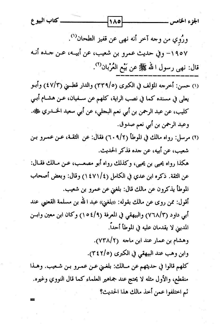 1957 - وفي حديث عمرو بن شعيب ، عن أبيه ، عن جده أنه قال : نهى رسول الله [ صلى الله عليه وسلم ] عن بيع العربان ( 2 ) .
