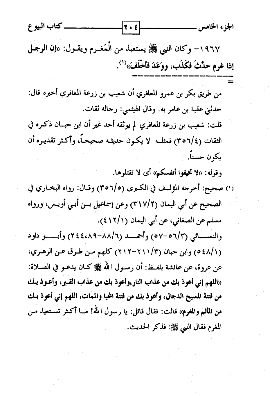 1967 - وكان النبي [ صلى الله عليه وسلم ] يستعيذ من المغرم ويقول : ' إن الرجل إذا غرم حدث فكذب ، ووعد فأخلف ' ( 1 ) .