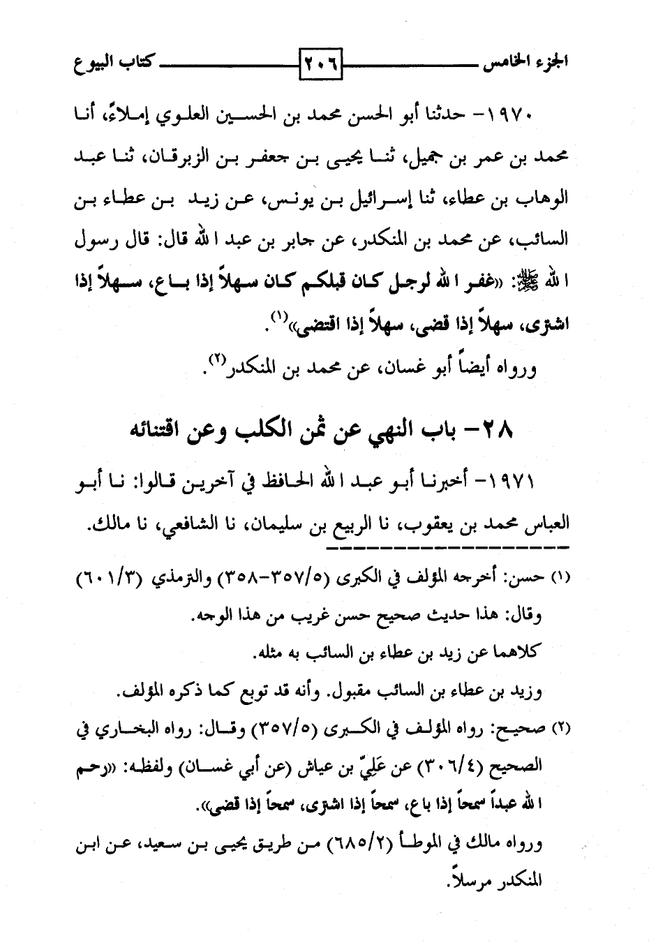 1970 - حدثنا أبو الحسن محمد بن الحسين العلوي إملاءً ، أنا محمد بن عمر بن جميل ، ثنا يحيى بن جعفر بن الزبرقان ، ثنا عبد الوهاب بن عطاء ، ثنا إسرائيل بن يونس ، عن زيد بن عطاء بن السائب ، عن محمد بن المنكدر ، عن جابر بن عبد الله قال : قال رسول الله [ صلى الله عليه وسلم ] : ' غفر الله لرجل كان قبلكم كان سهلاً إذا باع ، سهلا إذا اشترى ، سهلاً إذا قضى ، سهلاً إذا اقتضى ' ( 1 ) . ورواه أيضاً أبو غسان ، عن محمد بن المنكدر ( 2 ) . 28 - باب النهي عن ثمن الكلب وعن اقتنائه
