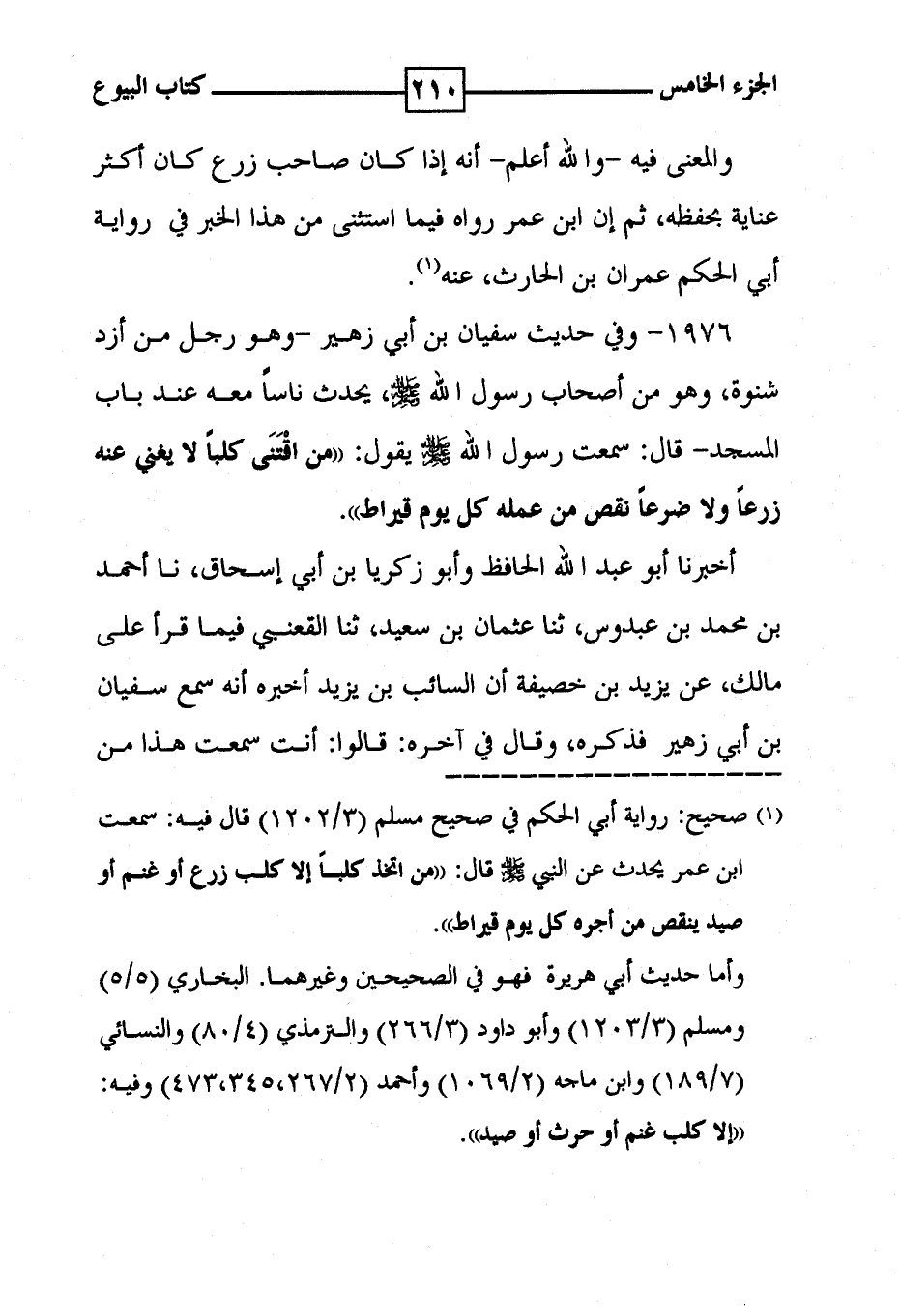 1976 - وفي حديث سفيان بن أبي زهير - وهو رجل من أزد شنوة ، وهو من أصحاب رسول الله [ صلى الله عليه وسلم ] ، يحدث ناساً معه عند باب المسجد - قال : سمعت رسول الله [ صلى الله عليه وسلم ] يقول : ' من اقتنى كلباً لا يغني عنه زرعاً ولا ضرعاً نقص من عمله كل يوم قيراط ' . أخبرنا أبو عبد الله الحافظ وأبو زكريا بن أبي إسحاق ، نا أحمد بن محمد بن عبدوس ، ثنا عثمان بن سعيد ، ثنا القعنبي فيما قرأ على مالك ، عن يزيد بن خصيفة أن السائب بن يزيد أخبره أنه سمع سفيان بن أبي زهير فذكره ، وقال في آخره : قالوا : أنت سمعت هذا من