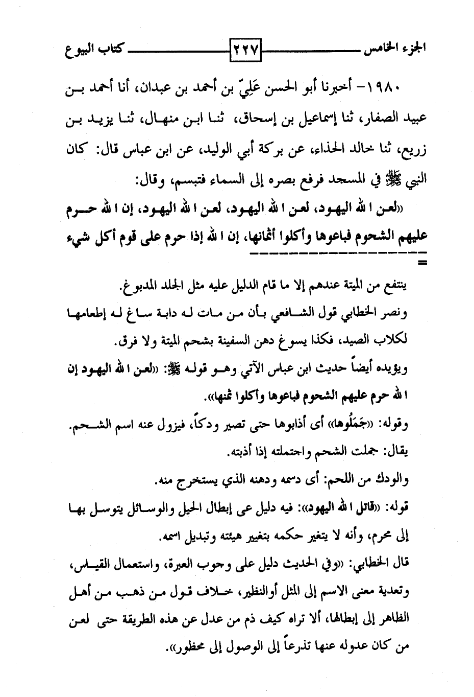 1980 - أخبرنا أبو الحسن علي بن أحمد بن عبدان ، أنا أحمد بن عبيد الصفار ، ثنا إسماعيل بن إسحاق ، ثنا ابن منهال ، ثنا يزيد بن زريع ، ثنا خالد الحذاء ، عن بركة أبي الوليد ، عن ابن عباس قال : كان النبي [ صلى الله عليه وسلم ] في المسجد فرفع بصره إلى السماء فتبسم ، وقال : ' لعن الله اليهود ، لعن الله اليهود ، لعن الله اليهود ، إن الله حرم عليهم الشحوم فباعوها وأكلوا أثمانها ، إن الله إذا حرم على قوم أكل شيء