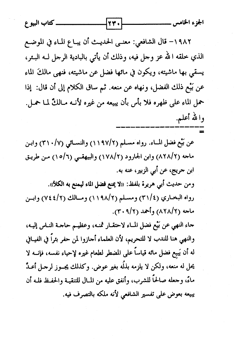 1982 - قال الشافعي : معنى الحديث أن يباع الماء في الموضع الذي خلقه الله عز وجل فيه ، وذلك أن يأتي بالبادية الرجل له البئر ، يسقي بها ماشيته ، ويكون في مائها فضل عن ماشيته ، فنهى مالك الماء عن بيع ذلك الفضل ، ، ونهاه عن منعه . ثم ساق الكلام إلى أن قال : إذا حمل الماء على ظهره فلا بأس بأن يبيعه من غيره لأنه مالك لما حمل . والله أعلم .
