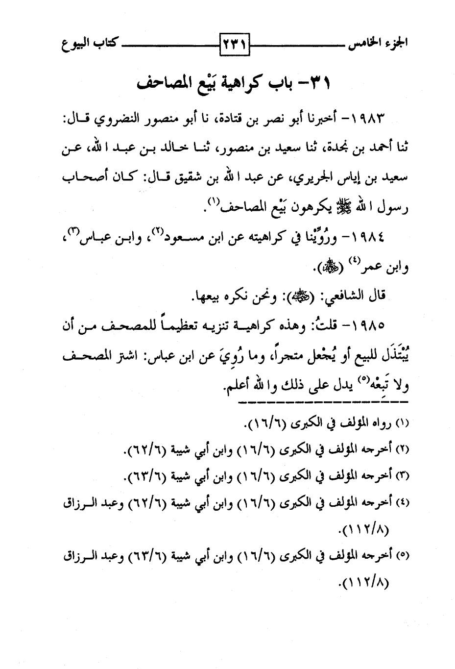 1983 - أخبرنا أبو نصر بن قتادة ، نا أبو منصور النضروي قال : ثنا أحمد بن نجدة ، ثنا سعيد بن منصور ، ثنا خالد بن عبد الله ، عن سعيد بن إياس الجريري ، عن عبد الله بن شقيق قال : كان أصحاب رسول الله [ صلى الله عليه وسلم ] يكرهون بيع المصاحف ( 1 ) .