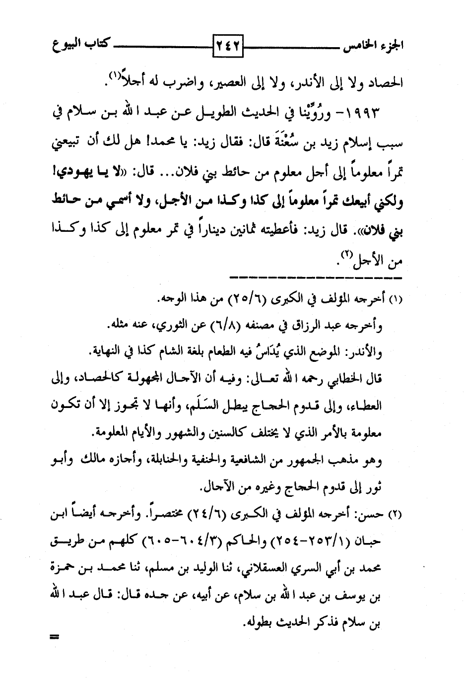 1993 - وروينا في الحديث الطويل عن عبد الله بن سلام في سبب إسلام زيد بن سعنة قال : فقال زيد : يا محمد ! هل لك أن تبيعني تمراً معلوماً إلى أجل معلوم من حائط بني فلان . . . قال : ' لا يا يهودي ! ولكني أبيعك تمراً معلوماً إلى كذا وكذا من الأجل ، ولا أسمي من حائط بني فلان ' . قال زيد : فأعطيته ثمانين ديناراً في تمر معلوم إلى كذا وكذا من الأجل ( 2 ) .