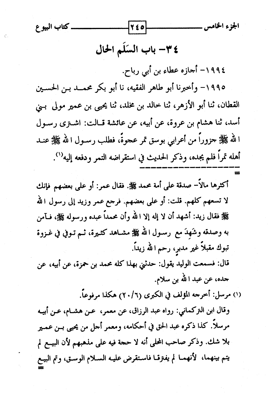 1995 - وأخبرنا أبو طاهر الفقيه ، نا أبو بكر محمد بن الحسين القطان ، ثنا أبو الأزهر ، ثنا خالد بن مخلد ، ثنا يحيى بن عمير مولى بني أسد ، ثنا هشام بن عروة ، عن أبيه ، عن عائشة قالت : اشترى رسول الله [ صلى الله عليه وسلم ] جزوراً من أعرابي بوسق تمر عجوة فطلب رسول الله [ صلى الله عليه وسلم ] عند أهله تمراً فلم يجده ، وذكر الحديث في استقراضه التمر ودفعه إليه ( 1 ) .