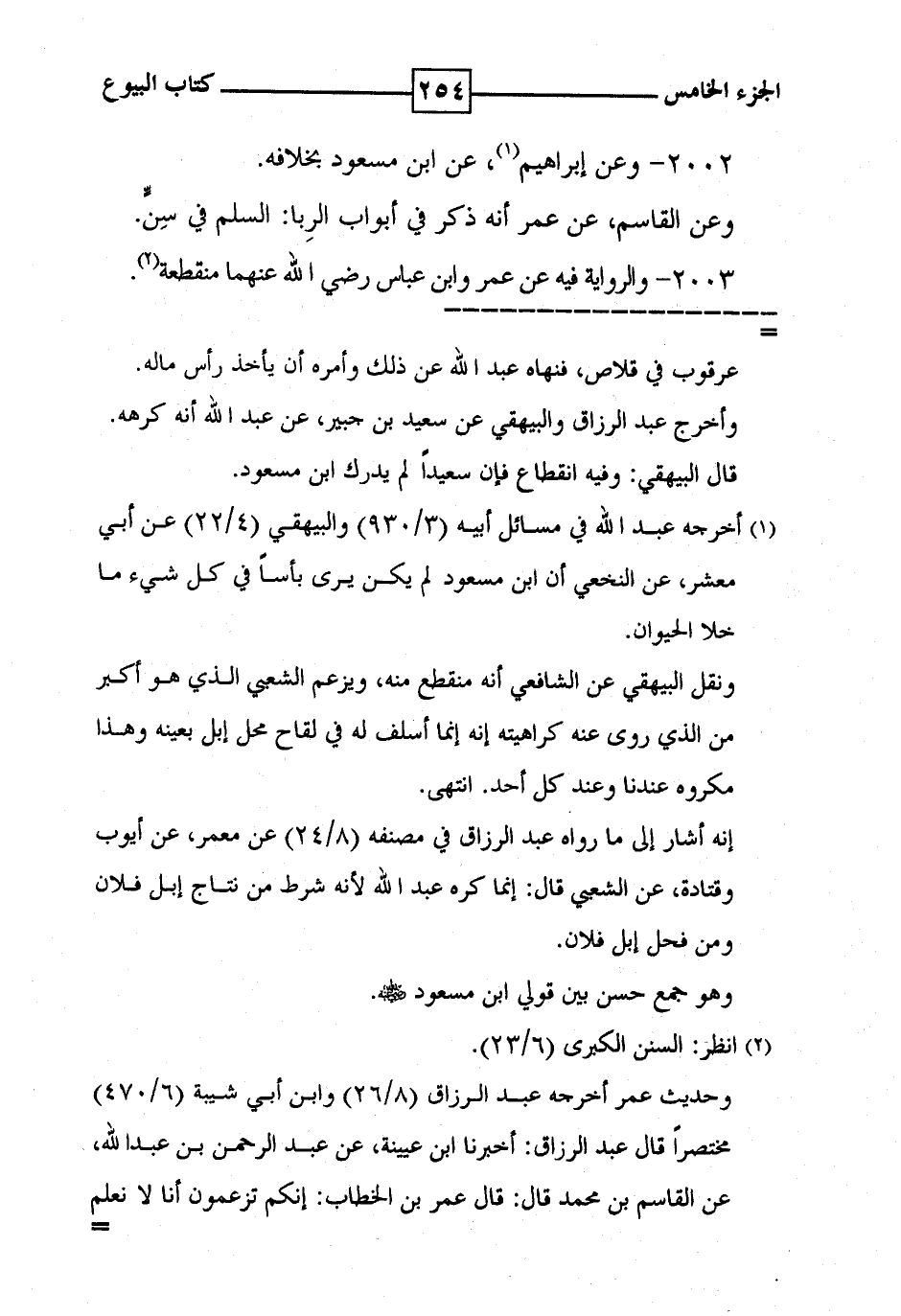 2002 - وعن إبراهيم ( 1 ) ، عن ابن مسعود بخلافه . وعن القاسم ، عن عمر أنه ذكر في أبواب الربا : السلم في سن .