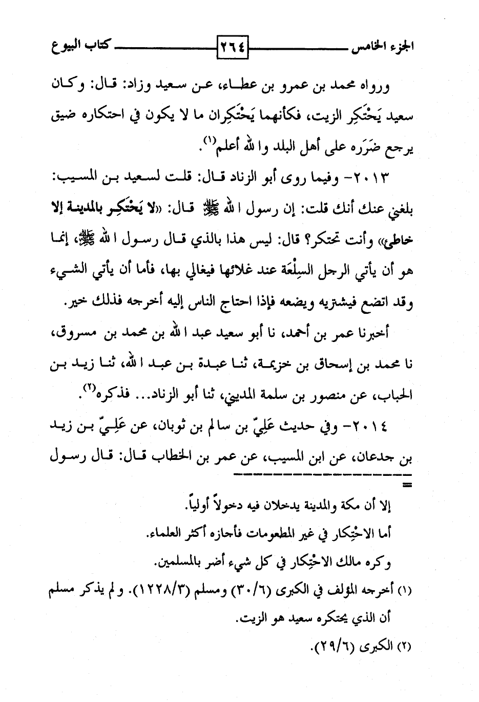 2013 - وفيما روى أبو الزناد قال : قلت لسعيد بن المسيب : بلغني عنك أنك قلت : إن رسول الله [ صلى الله عليه وسلم ] قال : ' لا يحتكر بالمدينة إلا خاطئ ' وأنت تحتكر ؟ قال : ' ليس هذا بالذي قال رسول الله [ صلى الله عليه وسلم ] إنما هو أن يأتي الرجل السلعة عند غلائها فيغالي بها ، فأما أن يأتي الشيء وقد اتضع فيشتريه ويضعه فإذا احتاج الناس إليه أخرجه فذلك خير . أخبرنا عمر بن أحمد ، نا أبو سعيد عبد الله بن محمد بن مسروق ، نا محمد بن إسحاق بن خزيمة ، ثنا عبدة بن عبد الله ، ثنا زيد بن الحباب ، عن منصور بن سلمة المديني ، ثنا أبو الزناد . . . فذكره ( 2 ) .