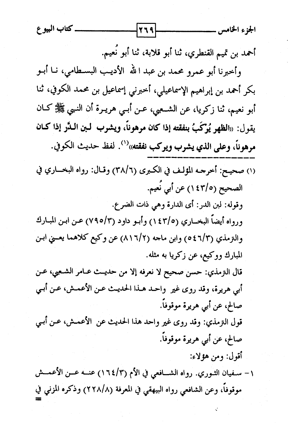 وأخبرنا أبو عمرو محمد بن عبد الله الأديب البسطامي ، نا أبو بكر أحمد بن إبراهيم الإسماعيلي ، أخبرني إسماعيل بن محمد الكوفي ، ثنا أبو نعيم ، ثنا زكريا ، عن الشعبي ، عن أبي هريرة أن النبي [ صلى الله عليه وسلم ] كان يقول : ' الظهر يركب بنفقته إذا كان مرهوناً ، ويشرب لبن الدر إذا كان مرهوناً ، وعلى الذي يشرب ويركب نفقته ' ( 1 ) . لفظ الحديث الكوفي .