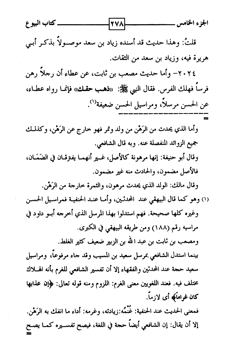 2024 - وأما حديث مصعب بن ثابت ، عن عطاء أن رجلاً رهن فرساً فهلك الفرس . فقال النبي [ صلى الله عليه وسلم ] : ' ذهب حقك ' فإنما رواه عطاء ، عن الحسن مرسلاً ، ومراسيل الحسن ضعيفة ( 1 ) .