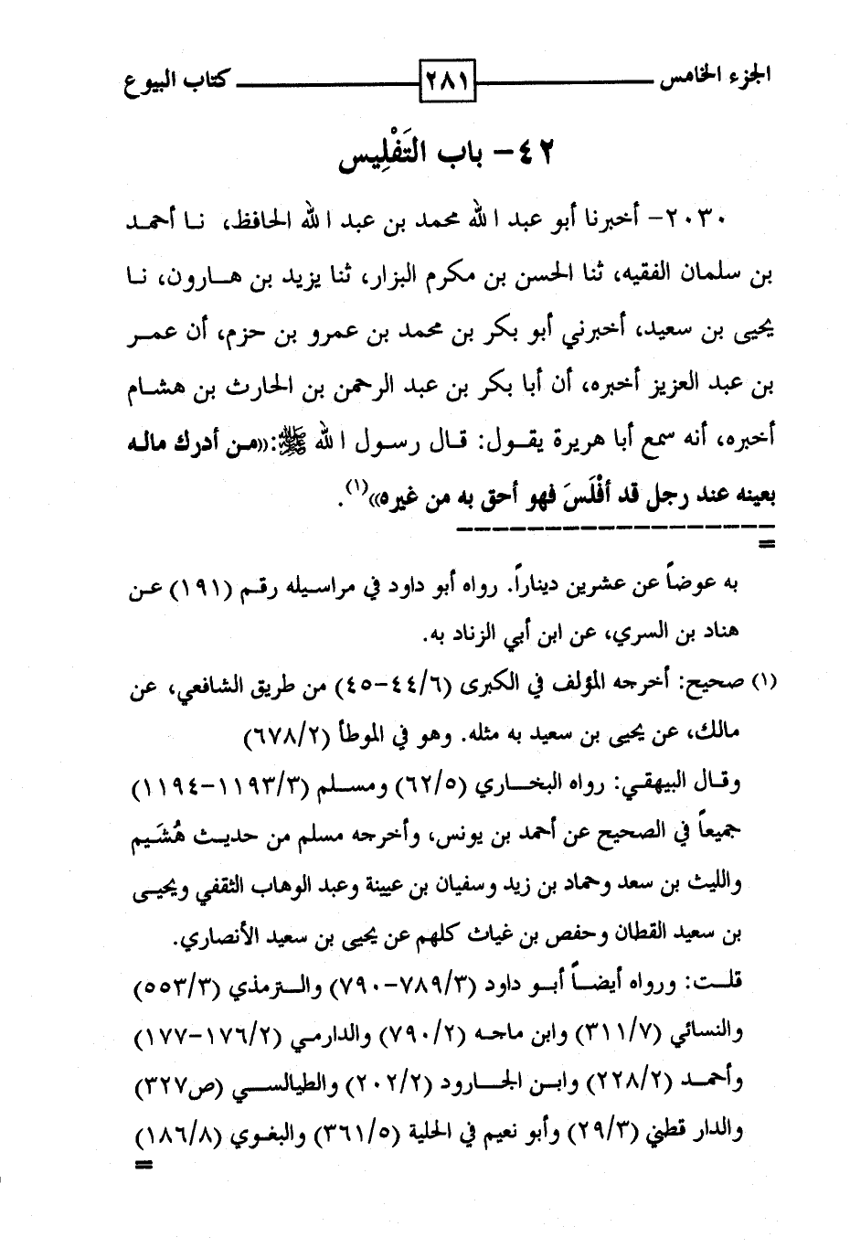 2030 - أخبرنا أبو عبد الله محمد بن عبد الله الحافظ ، نا أحمد بن سلمان الفقيه ، ثنا الحسن بن مكرم البزار ، ثنا يزيد بن هارون ، نا يحيى بن سعيد ، أخبرني أبو بكر بن محمد بن عمرو بن جزم ، أن عمر بن عبد العزيز أخبره ، أن أبا بكر بن عبد الرحمن بن الحارث بن هشام أخبره ، أنه سمع أبا هريرة يقول : قال رسول الله [ صلى الله عليه وسلم ] : ' من أدرك ماله بعينه عند رجل قد أفلس فهو أحق به من غيره ' ( 1 ) .
