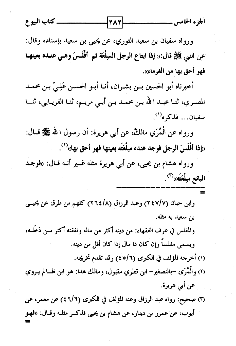 ورواه سفيان بن سعيد الثوري ، عن يحيى بن سعيد بإسناده وقال : عن النبي [ صلى الله عليه وسلم ] قال : ' إذا ابتاع الرجل السلعة ثم أفلس وهي عنده بعينها فهو أحق بها من الغرماء ' . أخبرناه أبو الحسين بن بشران ، أنا أبو الحسن علي بن محمد المصري ، ثنا عبد الله بن محمد بن أبي مريم ، ثنا الفريابي ، ثنا سفيان . . . فذكره ( 1 ) . ورواه عن المري مالك ، عن أبي هريرة : أن رسول الله [ صلى الله عليه وسلم ] قال : ' إذا أفلس الرجل فوجد عنده سلعته بعينها فهو أحق بها ' ( 2 ) . ورواه هشام بن يحيى ، عن أبي هريرة مثله غير أنه قال : ' فوجد البائع سلعته ' ( 3 ) .