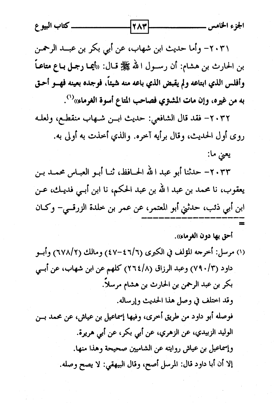 2031 - وأما حديث ابن شهاب ، عن أبي بكر بن عبد الرحمن بن الحارث بن هشام : أن رسول الله [ صلى الله عليه وسلم ] قال : ' أيما رجل باع متاعاً وأفلس الذي ابتاعه ولم يقبض الذي باعه منه شيئاً ، فوجده بعينه فهو أحق به من غيره ، وإن مات المشتري فصاحب المتاع أسوة الغرماء ' ( 1 ) .