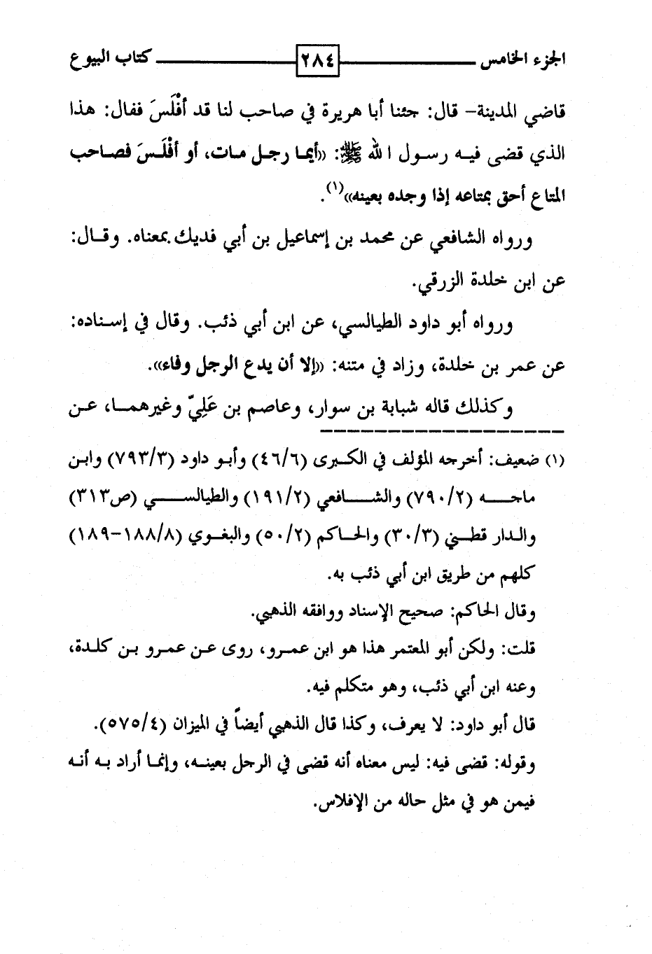 قاضي المدينة - قال : جئنا أبا هريرة في صاحب لنا قد أفلس فقال : هذا الذي قضى فيه رسول الله [ صلى الله عليه وسلم ] : ' أيما رجل مات ، أو أفلس فصاحب المتاع أحق بمتاعه إذا وجده بعينه ' ( 1 ) . ورواه الشافعي عن محمد بن إسماعيل بن أبي فديك بمعناه . وقال : عن ابن خلدة الزرقي . ورواه أبو داود الطيالسي ، عن ابن أبي ذئب . وقال في إسناده : عن عمر بن خلدة ، وزاد في متنه : ' إلا أن يدع الرجل وفاء ' . وكذلك قاله شبابة بن سوار ، وعاصم بن علي وغيرهما ، عن