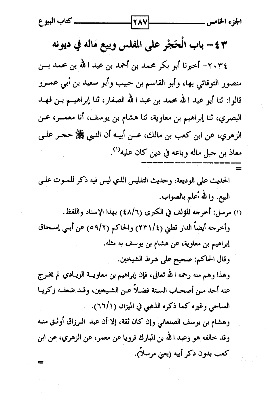 2034 - أخبرنا أبو بكر محمد بن أحمد بن عبد الله بن محمد بن منصور التوقاتي بها ، وأبو القاسم بن حبيب وأبو سعيد بن أبي عمرو قالوا : ثنا أبو عبد الله محمد بن عبد الله الصفار ، ثنا إبراهيم بن فهد البصري ، ثنا إبراهيم بن معاوية ، ثنا هشام بن يوسف ، أنا معمر ، عن الزهري ، عن ابن كعب بن مالك ، عن أبيه أن النبي [ صلى الله عليه وسلم ] حجر على معاذ بن جبل ماله وباعه في دين كان عليه ( 1 ) .