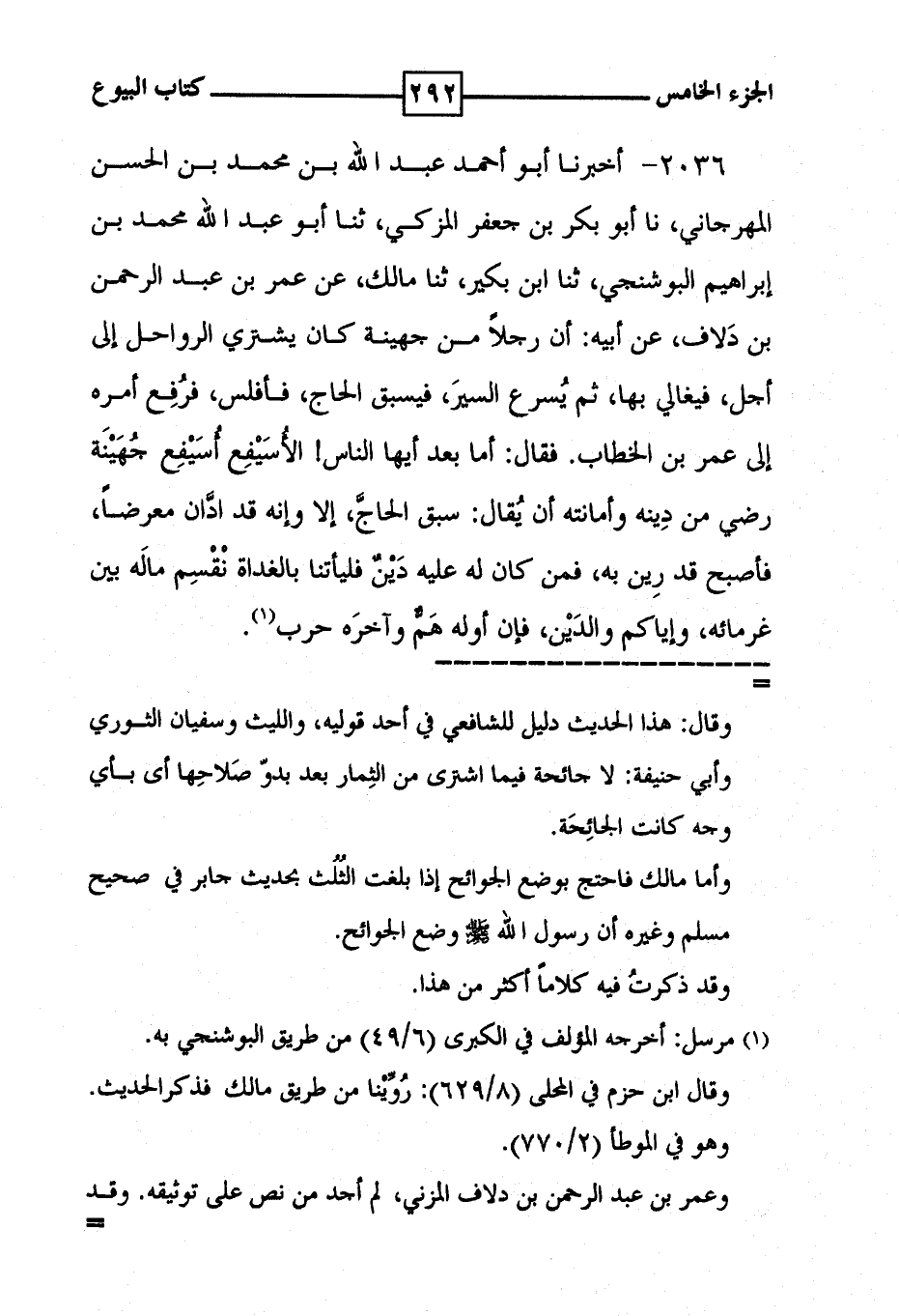 2036 - أخبرنا أبو أحمد عبد الله بن محمد بن الحسن المهرجاني ، نا أبو بكر بن جعفر المزكي ، ثنا أبو عبد الله محمد بن إبراهيم البوشنجي ، ثنا ابن بكير ، ثنا مالك ، عن عمر بن عبد الرحمن بن دلاف ، عن أبيه أن رجلاً من جهينة كان يشتري الرواحل إلى أجل ، فيغالي بها ، ثم يسرع السير ، فيسبق الحاج ، فأفلس ، فرفع أمره إلى عمر بن الخطاب . فقال : أما بعد أيها الناس ! الأسيفع أسيفع جهينة رضي من دينه وأمانته أن يقال : سبق الحاج ، إلا وإنه قد ادان معرضاً ، فأصبح قد رين به ، فمن كان له عليه دين فليأتنا بالغداة نقسم ماله بين غرمائه ، وإياكم والدين ، فإن أوله هم وآخره حرب ( 1 ) .