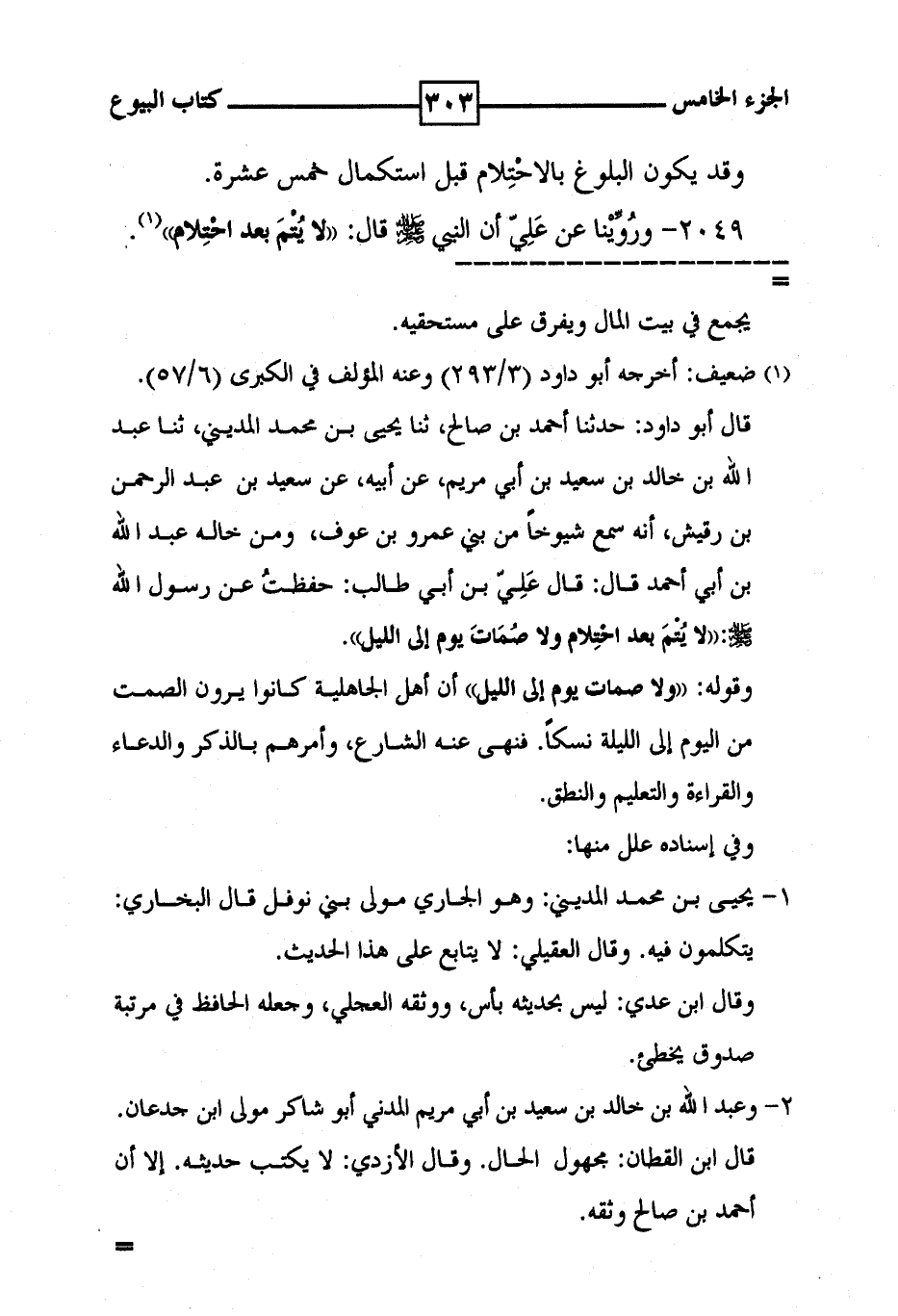 2049 - وروينا عن علي أن النبي [ صلى الله عليه وسلم ] قال : ' لا يتم بعد احتلام ' ( 1 ) .
