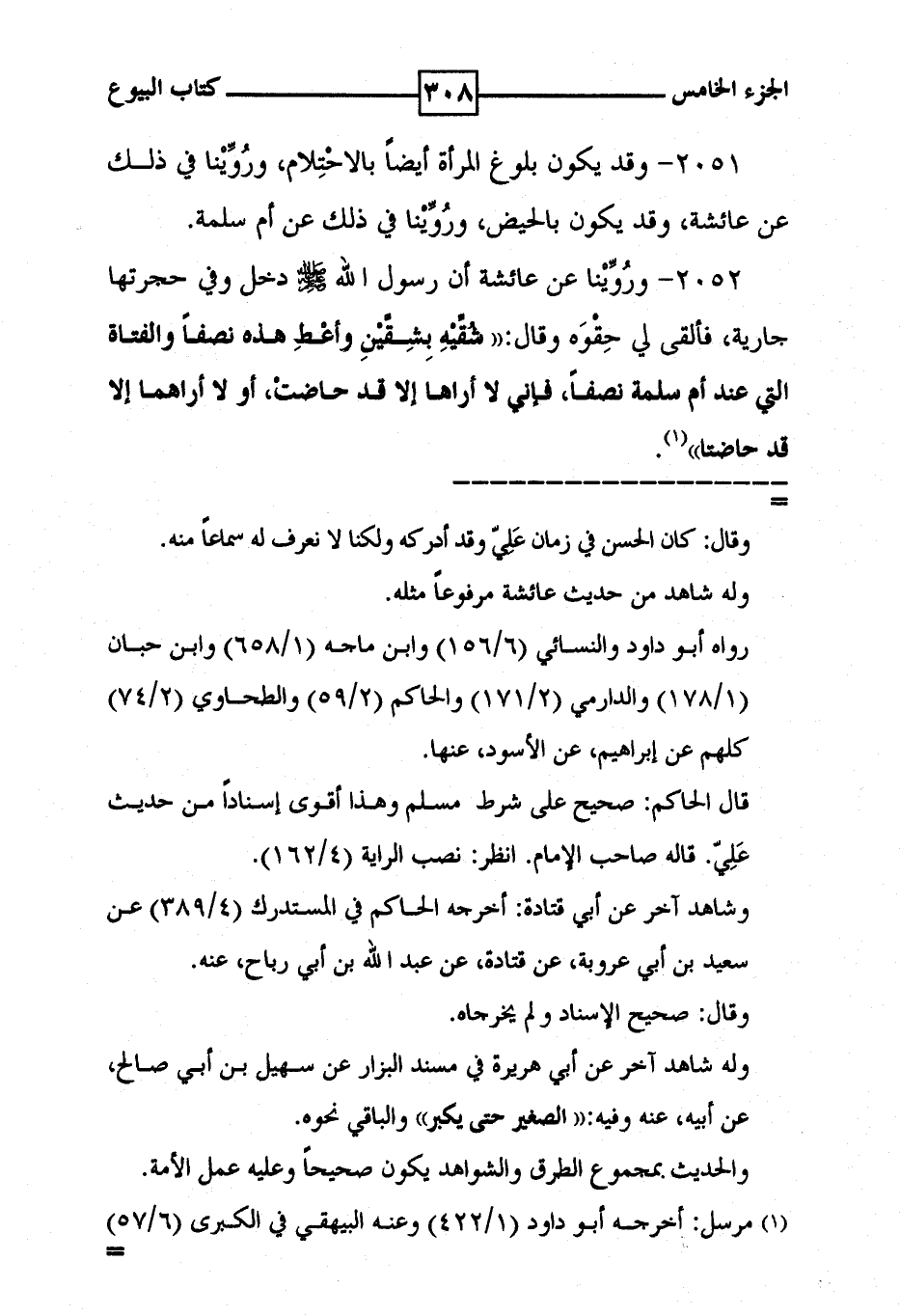 2051 - وقد يكون بلوغ المرأة أيضاً بالاحِتْلام ، وروينا في ذلك عن عائشة ، وقد يكون بالحيض ، وروينا في ذلك عن أم سلمة .