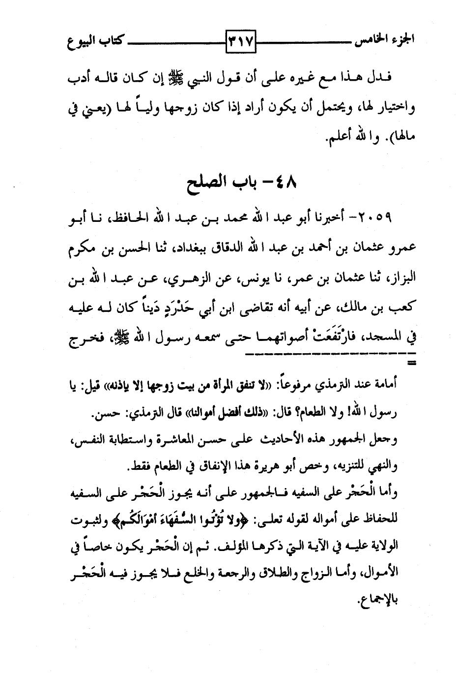 فدل هذا مع غيره على أن قول النبي [ صلى الله عليه وسلم ] إن كان قاله أدب واختيار لها ، ويحتمل أن يكون أراد إذا كان زوجها ولياً لها ( يعني في مالها ) . والله أعلم . 48 - باب الصلح