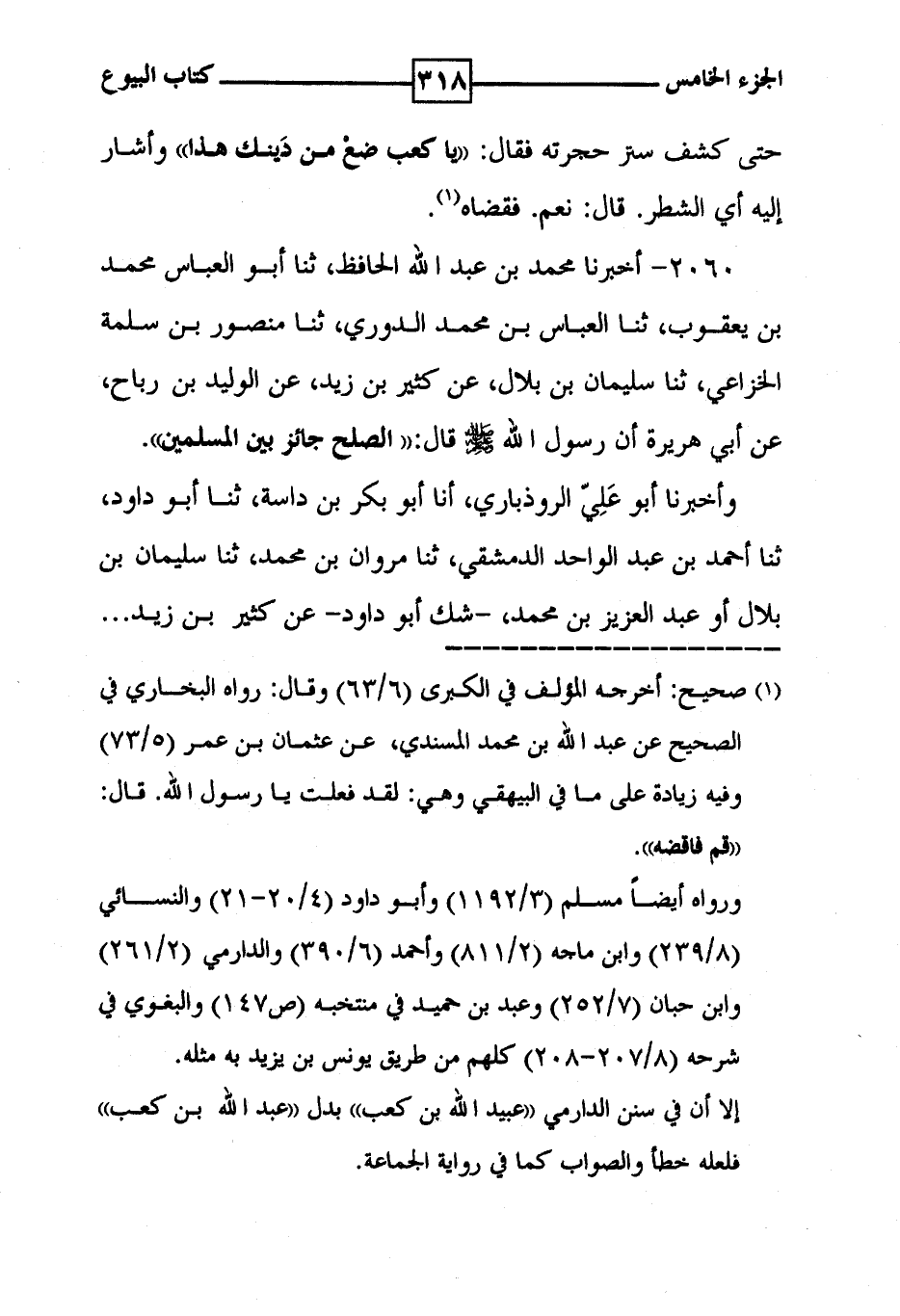 2060 - أخبرنا محمد بن عبد الله الحافظ ، ثنا أبو العباس محمد بن يعقوب ، ثنا العباس بن محمد الدوري ، ثنا منصور بن سلمة الخزاعي ، ثنا سليمان بن بلال ، عن كثير بن زيد ، عن الوليد بن رباح ، عن أبي هريرة أن رسول الله [ صلى الله عليه وسلم ] قال : ' الصلح جائز بين المسلمين ' . وأخبرنا أبو علي الروذباري ، أنا أبو بكر بن داسة ، ثنا أبو داود ، ثنا أحمد بن عبد الواحد الدمشقي ، ثنا مروان بن محمد ، ثنا سليمان بن بلال أو عبد العزيز بن محمد ، - شك أبو داود - عن كثير بن زيد . . .