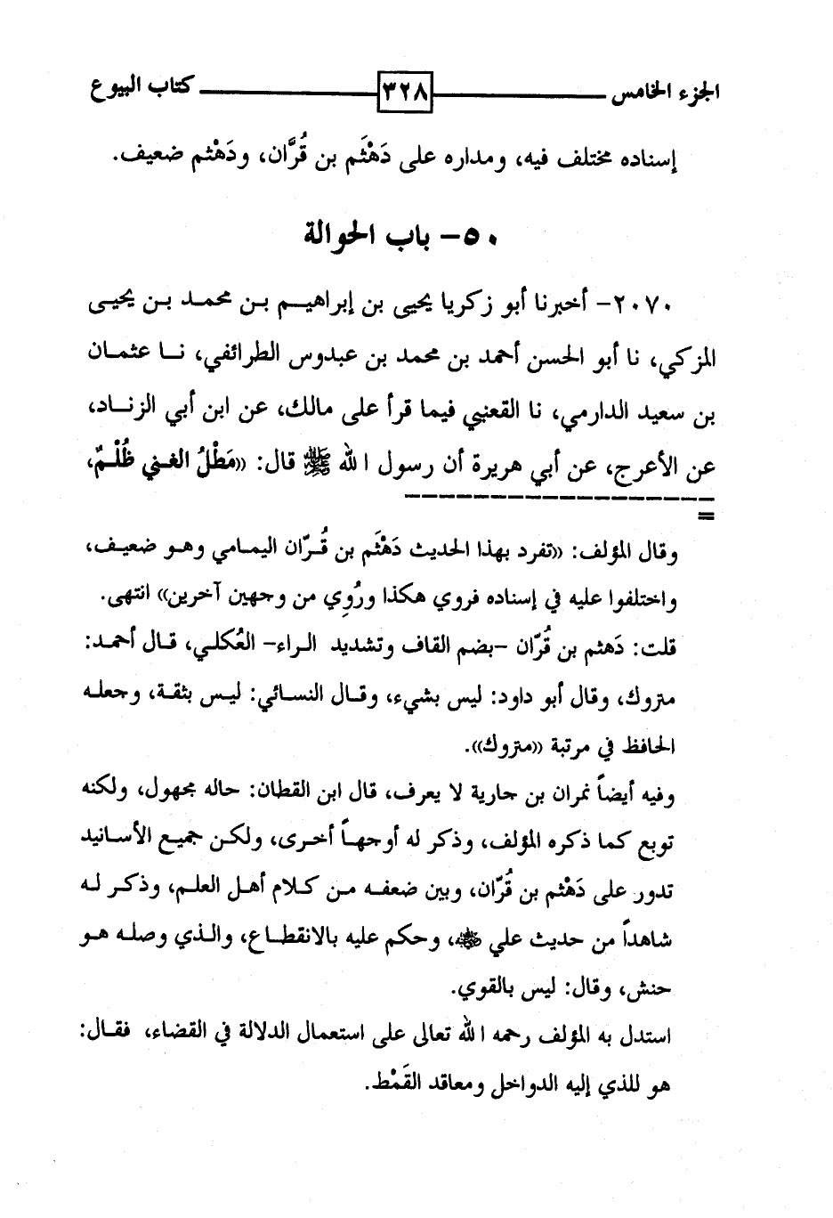 إسناده مختلف فيه ، ومداره على دهثم بن قران ، ودهثم ضعيف . 50 - باب الحوالة
