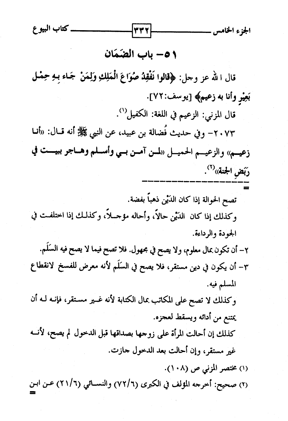 51 - باب الضَمَان قال الله عز وجل : ! ( قالوا نفقد صواع الملك ولمن جاء به حمل بعير وأنا به زعيم ) ! [ يوسف : 72 ] . قال المزني : الزعيم في اللغة : الكفيل ( 1 ) .