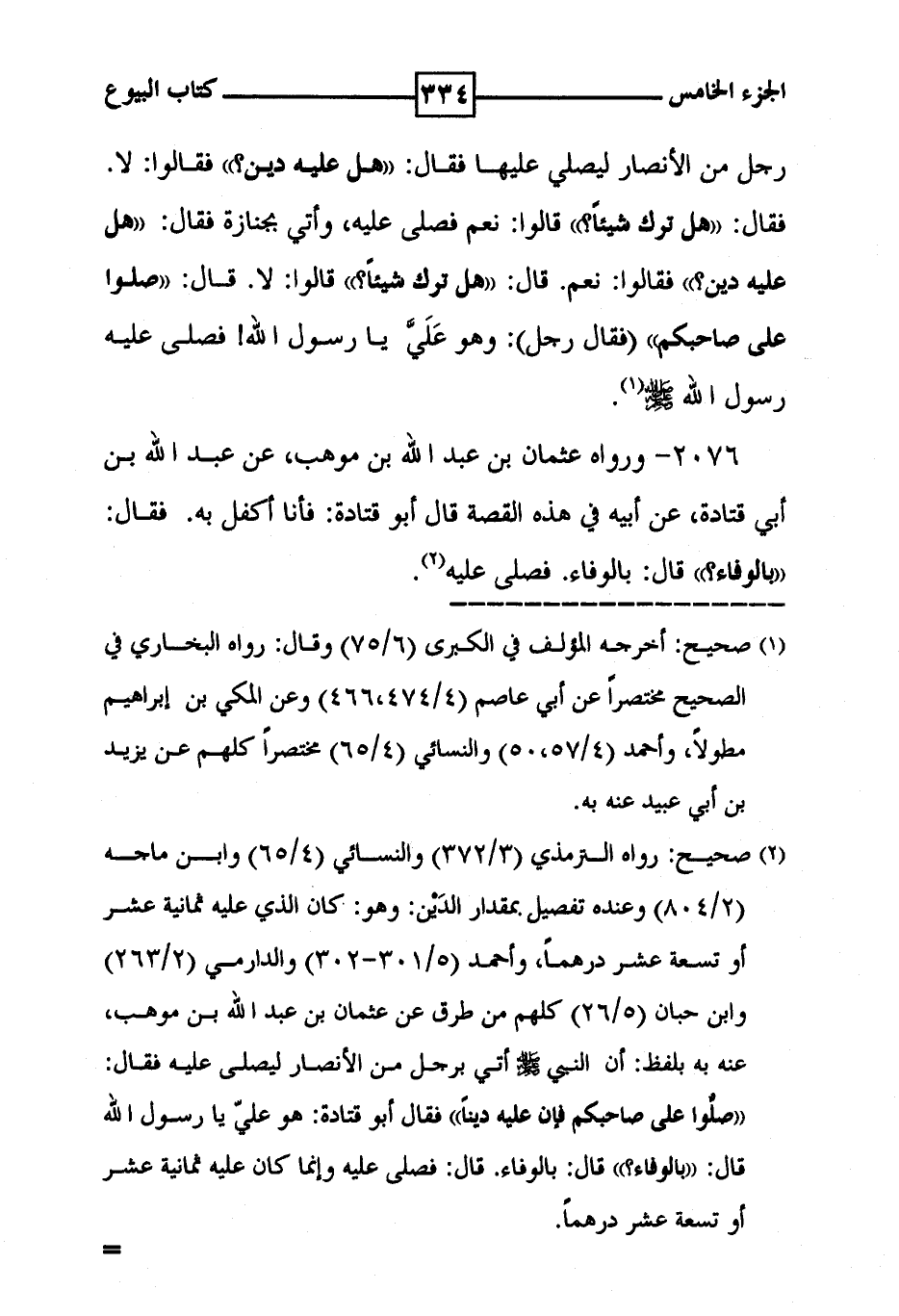 2076 - ورواه عثمان بن عبد الله بن موهب ، عن عبد الله بن أبي قتادة ، عن أبيه في هذه القصة قال أبو قتادة : فأنا أكفل به . فقال : ' بالوفاء ؟ ' قال : بالوفاء . فصلى عليه ( 2 ) .