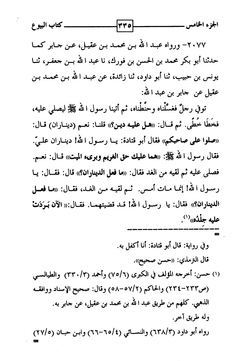 2077 - ورواه عبد الله بن محمد بن عقيل ، عن جابر كما حدثنا أبو بكر محمد بن الحسن بن فورك ، نا عبد الله بن جعفر ، ثنا يونس بن حبيب ، ثنا أبو داود ، ثنا زائدة ، عن عبد الله بن محمد بن عقيل عن جابر بن عبد الله : توفي رجل فغسلناه وحنطناه ، ثم أتينا رسول الله [ صلى الله عليه وسلم ] ليصلي عليه ، فخطا خطى . ثم قال : ' هل عليه دين ؟ ' قلنا : نعم ( ديناران ) قال : ' صلوا على صاحبكم ' فقال أبو قتادة : يا رسول الله ! ديناران علي . فقال رسول الله [ صلى الله عليه وسلم ] : ' هما عليك حق الغريم وبرىء الميت ' قال : نعم فصلى عليه ثم لقيه من الغد فقال : ' ما فعل الديناران ؟ ' قال : فقال : يا رسول الله ! إنما مات أمس . ثم لقيه من الغد ، فقال : ' ما فعل الديناران ؟ ' فقال : يا رسول الله ! قد قضيتهما . فقال : ' الآن بردت عليه جلده ' ( 1 ) .