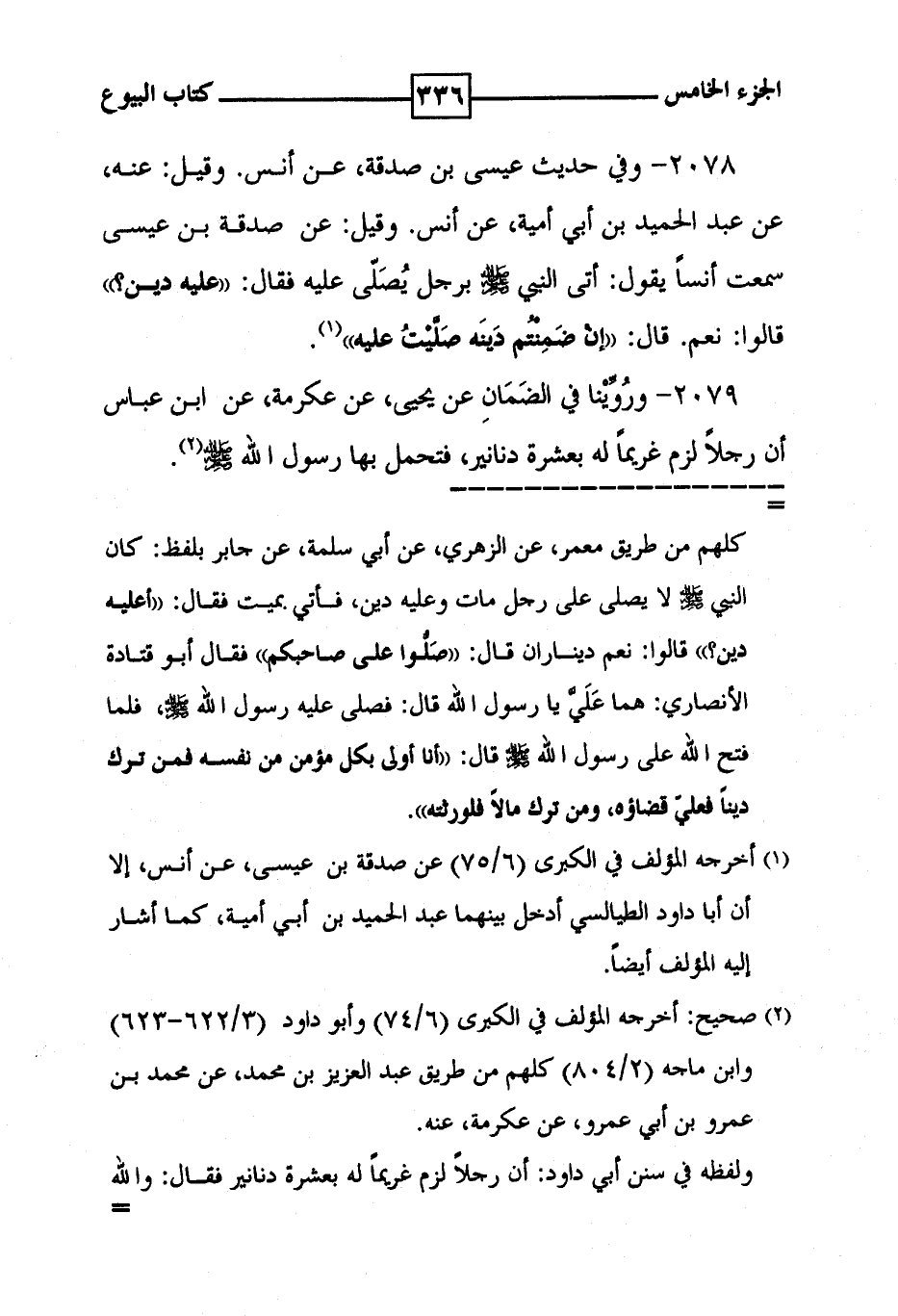 2078 - وفي حديث عيسى بن صدقة ، عن أنس . وقيل : عنه ، عن عبد الحميد بن أبي أمية ، عن أنس . وقيل : عن صدقة بن عيسى سمعت أنساً يقول : أتى النبي [ صلى الله عليه وسلم ] برجل يصلي عليه فقال : ' عليه دين ؟ ' قالوا : نعم . قال : ' إن ضمنتم دينه صليت عليه ؟ ' ( 1 ) .