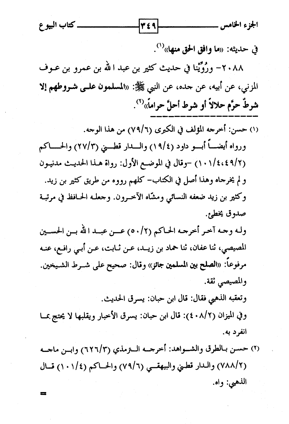 2088 - وروينا في حديث كثير بن عبد الله بن عمرو بن عوف المزني ، عن أبيه ، عن جده ، عن النبي [ صلى الله عليه وسلم ] : ' المسلمون على شروطهم إلا شرط حرم حلالاً أو شرط أحل حراماً ' ( 2 ) .