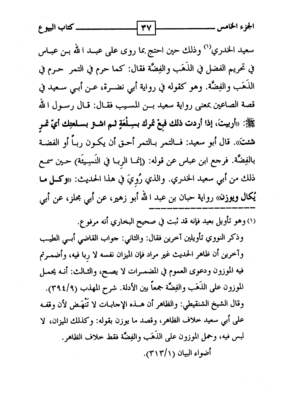 سعيد الخدري ( 1 ) وذلك حين احتج بما روى على عبد الله بن عباس في تحريم الفضل في الذهب والفضة فقال : كما حرم في التمر حرم في الذهب والفضة . وهو كقوله في رواية أبي نضرة ، عن أبي سعيد في قصة الصاعين بمعنى رواية سعيد بن المسيب فقال : قال رسول الله [ صلى الله عليه وسلم ] : ' أربيت ، إذا أردت ذلك فبع تمرك بسلعة ثم اشتر بسلعتك أي تمرٍ شئت ' . قال أبو سعيد : فالتمر بالتمر أحق أن يكون رباً أو الفضة بالفضة . فرجع ابن عباس عن قوله : ( إنما الربا في النسيئة ) حين سمع ذلك من أبي سعيد الخدري . والذي روي في هذا الحديث : ' وكل ما يكال ويوزن ' رواية حبان بن عبد الله أبو زهير ، عن أبي مجلز ، عن أبي