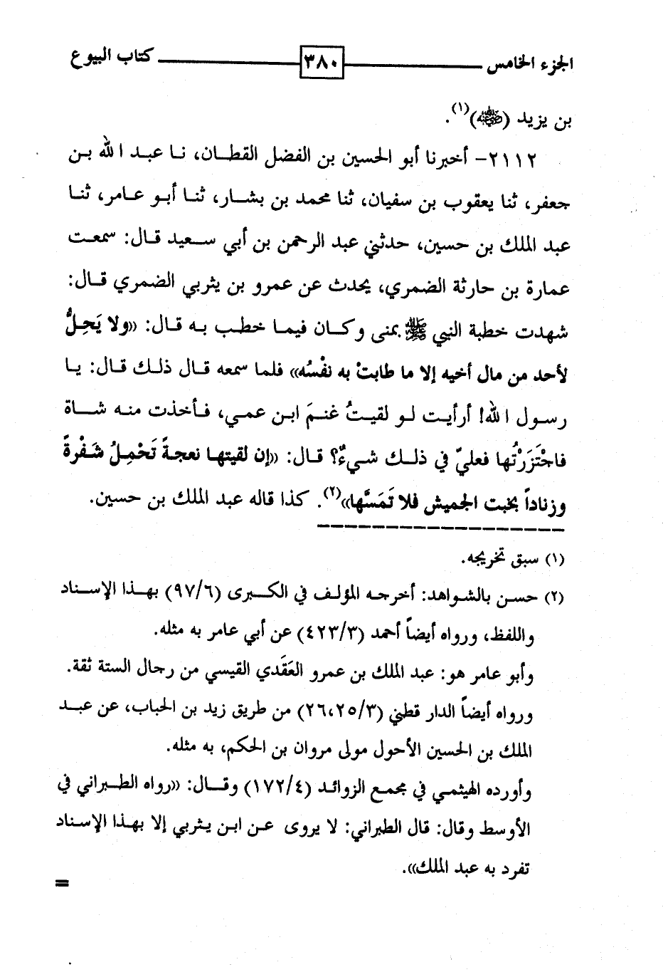 2112 - أخبرنا أبو الحسين بن الفضل القطان ، نا عبد الله بن جعفر ، ثنا يعقوب بن سفيان ، ثنا محمد بن بشار ، ثنا أبو عامر ، ثنا عبد الملك بن حسين ، حدثني عبد الرحمن بن أبي سعيد قال : سمعت عمارة بن حارثة الضمري ، يحدث عن عمرو بن يثربي الضمري قال : شهدت خطبة النبي [ صلى الله عليه وسلم ] بمنى وكان فيما خطب به قال : ' ولا يَحِلُّ لأحد من مال أخيه إلا ما طابتْ به نفْسُه ' فلما سمعه قال ذلك قال : يا رسول الله أرأيت لو لقيت غنم ابن عمي ، فأخذت منه شاة فاجْتَزَرْتُها فعليّ في ذلك شيءٌ ؟ قال : ' إن لقيتها نعجةً تًحْمِلُ شَفْرةً وزناداً بخبت الجميش فلا تَمَسَّها ' ( 2 ) . كذا قاله عبد الملك بن حسين .