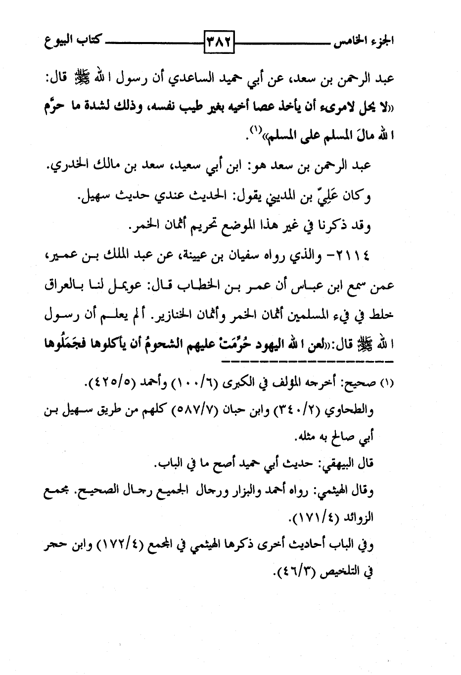 عبد الرحمن بن سعد ، عن أبي حميد الساعدي أن رسول الله [ صلى الله عليه وسلم ] قال : ' لا يحل لامرئ أن يأخذ عصا أخيه بغير طيب نفسه ، وذلك لشدة ما حرم الله مال المسلم على المسلم ' ( 1 ) . عبد الرحمن بن سعد هو : ابن أبي سعيد ، سعد بن مالك الخدري . وكان علي بن المديني يقول : الحديث عندي حديث سهيل . وقد ذكرنا في غير هذا الموضع تحريم أثمان الخمر .