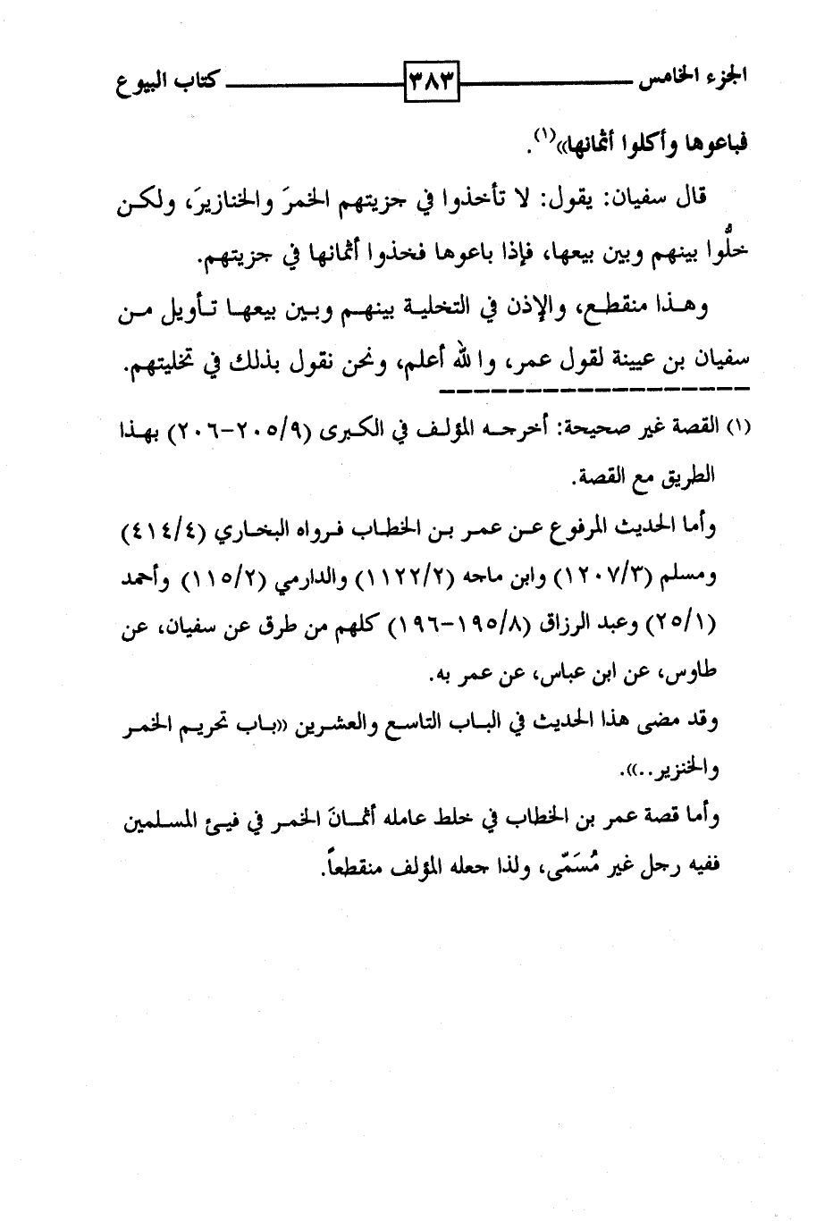 فباعوها وأكلوها أثمانها ' ( 1 ) . قال سفيان : يقول : لا تأخذوا في جزيتهم الخمرَ والخنازيرَ ، ولكن خلُّو بينهم وبين بيعها ، فإذا باعوها فخذوا أثمانها في جزيتهم . وهذا منقطع ، والإذن في التخلية بينهم وبين بيعها تأويل من سفيان بن عيينة لقول عمر ، والله أعلم ، ونحن نقول بذلك في تخليتهم .