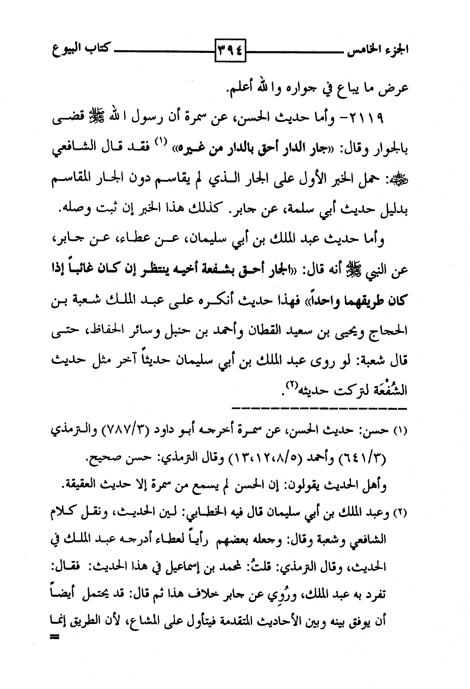 2119 - وأما حديث الحسن ، عن سمرة أن رسول الله [ صلى الله عليه وسلم ] قضى بالجوار وقال : ' جار الدار أحق بالدار من غيره ' ( 1 ) فقد قال الشافعي ( رضى الله عنه ) : حمل الخبر الأول على الجار الذي لم يقاسم دون الجار المقاسم بدليل حديث أبي سلمة ، عن جابر . كذلك هذا الخبر إن ثبت وصله . وأما حديث عبد الملك بن أبي سليمان ، عن عطاء ، عن جابر ، عن النبي [ صلى الله عليه وسلم ] أنه قال : ' الجار أحق بشفعة أخيه ينتظر إن كان غائباً إذا كان طريقهما واحداً ' فهذا حيث أنكره على عبد الملك شعبة بن الحجاج ويحيى بن سعيد القطان وأحمد بن حنبل وسائر الحفاظ ، حتى قال شعبة : لو روى عبد الملك بن أبي سليمان حديثاً آخر مثل حديث الشفعة لتركت حديثه ( 2 ) .