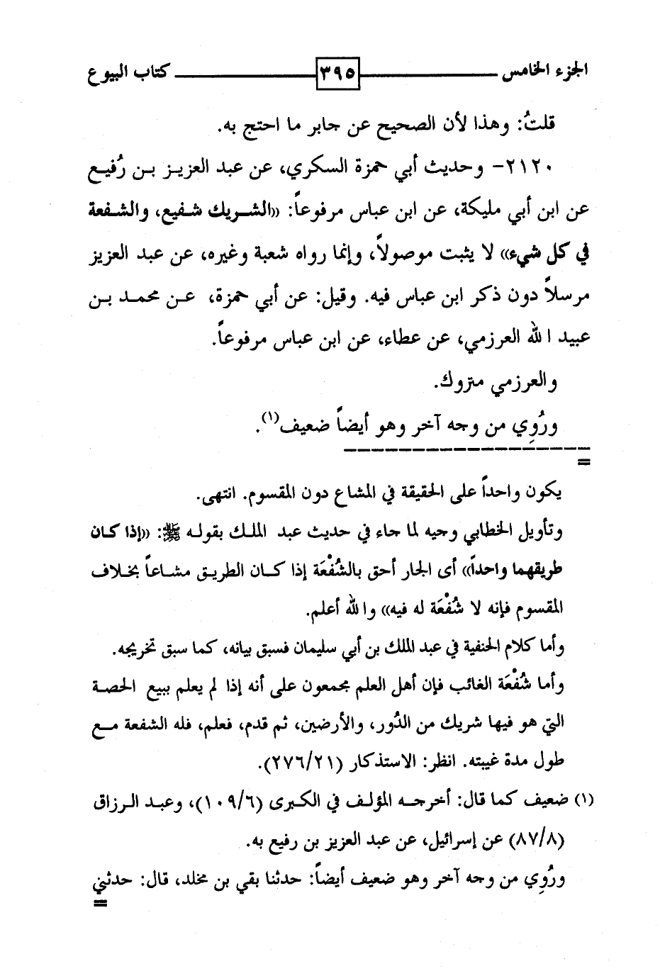 2120 - وحديث أبي حمزة السكري ، عن عبد العزيز بن رفيع عن ابن أبي مليكة ، عن ابن عباس مرفوعاً : ' الشريك شفيع ، والشفعة في كل شيء ' لا يثبت موصولاً ، وإنما رواه شعبة وغيره ، عن عبد العزيز مرسلاً دون ذكر ابن عباس فيه . وقيل : عن أبي حمزة ، عن محمد بن عبيد الله العرزمي ، عن عطاء عن ابن عباس مرفوعاً . والعرزمي متروك . وروي من وجه آخر وهو أيضاً ضعيف ( 1 ) .