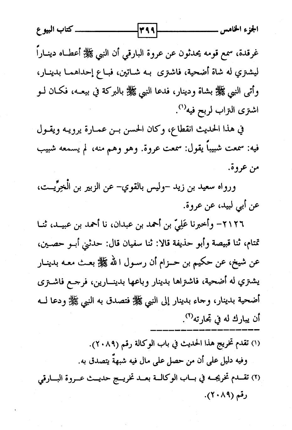 2126 - وأخبرنا علي بن أحمد بن عبدان ، نا أحمد بن عبيد ، ثنا تمتام ، ثنا قبيصة وأبو حذيفة قالا : ثنا سفيان قال : حدثني أبو حصين ، عن شيخ ، عن حكيم بن حزام أن رسول الله [ صلى الله عليه وسلم ] بعث معه بدينار يشتري له أضحية ، فاشتراها بدينار وباعها بدينارين ، فرجع فاشترى أضحية بدينار ، وجاء بدينار إلى النبي [ صلى الله عليه وسلم ] فتصدق به النبي [ صلى الله عليه وسلم ] ودعا له أن يبارك له في تجارته ( 2 ) .