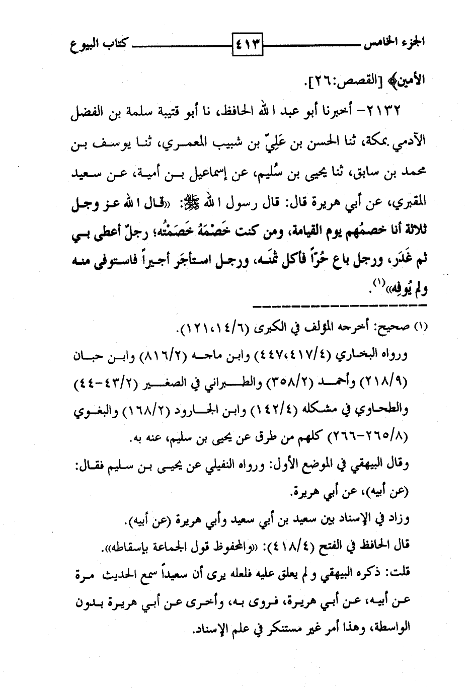 2132 - أخبرنا أبو عبد الله الحافظ ، نا أبو قتيبة سلمة بن الفضل الآدمي بمكة ، ثنا الحسن بن علي بن شبيب المعمري ، ثنا يوسف بن محمد بن سابق ، ثنا يحيى بن سليم ، عن إسماعيل بن أمية ، عن سعيد المقبري ، عن أبي هريرة قال : قال رسول الله [ صلى الله عليه وسلم ] : ' قال الله عز وجل ثلاثة أنا خصمهم يوم القيامة ، ومن كنت خصمه ، رجل أعطى بي ثم غدر ، ورجل باع حراً فأكل ثمنه ، ورجل استأجر أجيراً فاستوفى منه ولم يوفه ' ( 1 ) .