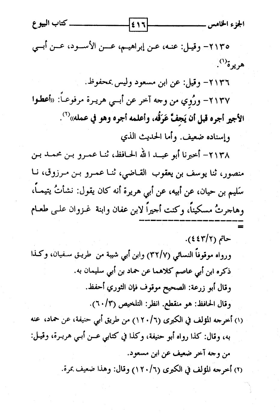 2137 - وروي من وجه آخر عن أبي هريرة مرفوعاً : ' أعطوا الأجير أجره قبل أن يجف عرقه ، وأعلمه أجره وهو في عمله ' ( 2 ) . وإسناده ضعيف . وأما الحديث الذي .