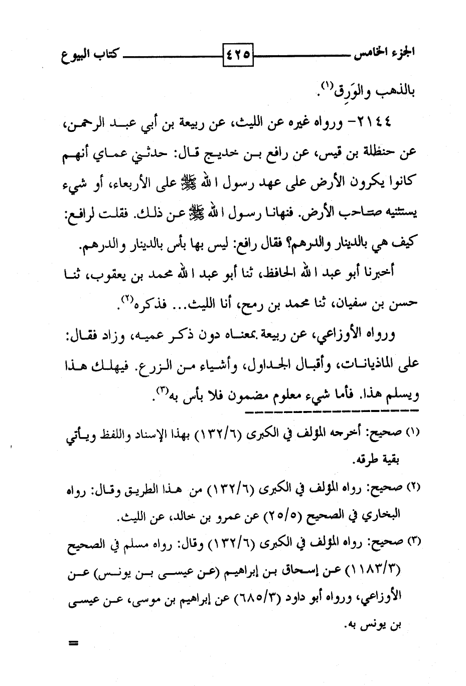 2144 - ورواه غيره عن الليث ، عن ربيعة بن أبي عبد الرحمن ، عن حنظلة بن قيس ، عن رافع بن خديج قال : حدثني عماي أنهم كانوا يكرون الأرض على عهد رسول الله [ صلى الله عليه وسلم ] على الأربعاء ، أو شيء يستثنيه صاحب الأرض ، فنهانا رسول الله [ صلى الله عليه وسلم ] عن ذلك . فقلت لرافع : كيف هي بالدينار والدرهم ؟ فقال رافع : ليس بها بأس بالدينار والدرهم . أخبرنا أبو عبد الله الحافظ ، ثنا أبو عبد الله محمد بن يعقوب ، ثنا حسن بن سفيان ، ثنا محمد بن رمح ، أنا الليث . . . فذكره ( 2 ) . ورواه الأوزاعي ، عن ربيعة بمعناه دون ذكر عميه ، وزاد فقال : على الماذيانات ، وأقبال الجداول ، وأشياء من الزرع . فيهلك هذا ويسلم هذا . فأما شيء معلوم مضمون فلا بأس به ( 3 ) .