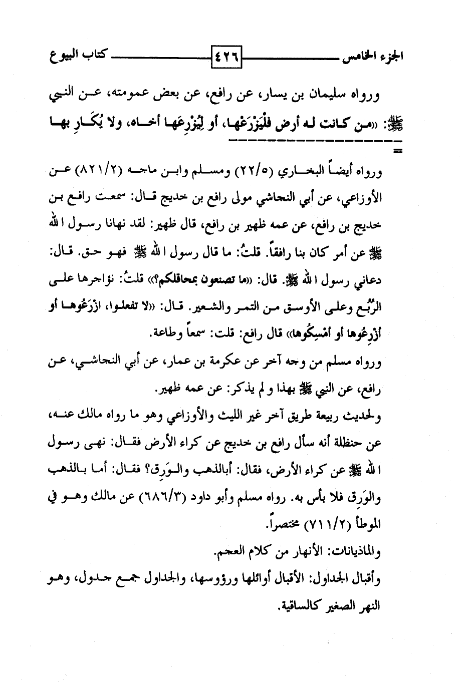 ورواه سليمان بن يسار ، عن رافع ، عن بعض عمومته ، عن النبي [ صلى الله عليه وسلم ] : ' من كانت له أرض فليزرعها ، أو ليزرعها أخاه ، ولا يكار بها
