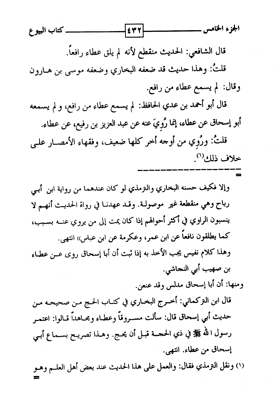 قال الشافعي الحديث منقطع لأنه لم يلق عطاء رافعاً . قلت : وهذا حديث قد ضعفه البخاري وضعفه موسى بن هارون وقال : لم يسمع عطاء من رافع . قال أبو أحمد بن عدي الحافظ : لم يسمع عطاء من رافع ، ولم يسمعه أبو إسحاق عن عطاء ، إنما روي عنه عن عبد العزيز بن رفيع ، عن عطاء . قلت : وروي من أوجه أخر كلها ضعيف ، وفقهاء الأمصار على خلاف ذلك ( 1 ) .