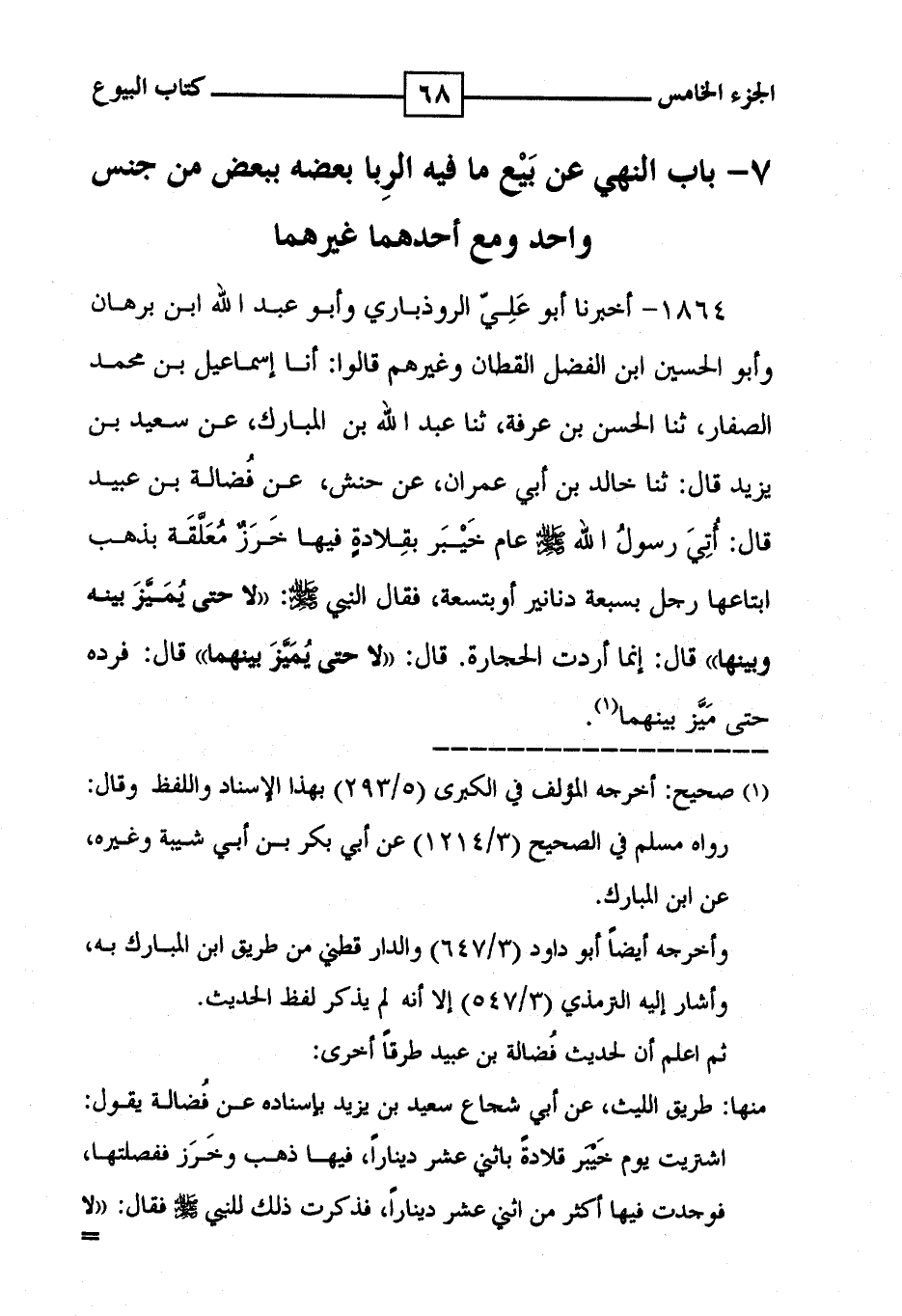 1864 - أخبرنا أبو علي الروذباري وأبو عبد الله ابن برهان وأبو الحسين ابن الفضل القطان وغيرهم قالوا : أنا إسماعيل بن محمد الصفار ، ثنا الحسن بن عرفة ، ثنا عبد الله بن المبارك ، عن سعيد بن يزيد قال : ثنا خالد بن أبي عمران ، عن حنش ، عن فضالة بن عبيد قال : أتى رسول الله [ صلى الله عليه وسلم ] عام خيبر بقلادة فيها خرز معلقة بذهب ابتاعها رجل بسبعة دنانير أو بتسعة ، فقال النبي [ صلى الله عليه وسلم ] : ' لا حتى يميز بينه وبينها ' قال ' إنما أردت الحجارة . قال : ' لا حتى يميز بينهما ' قال : فرده حتى ميز بينهما ( 1 ) .