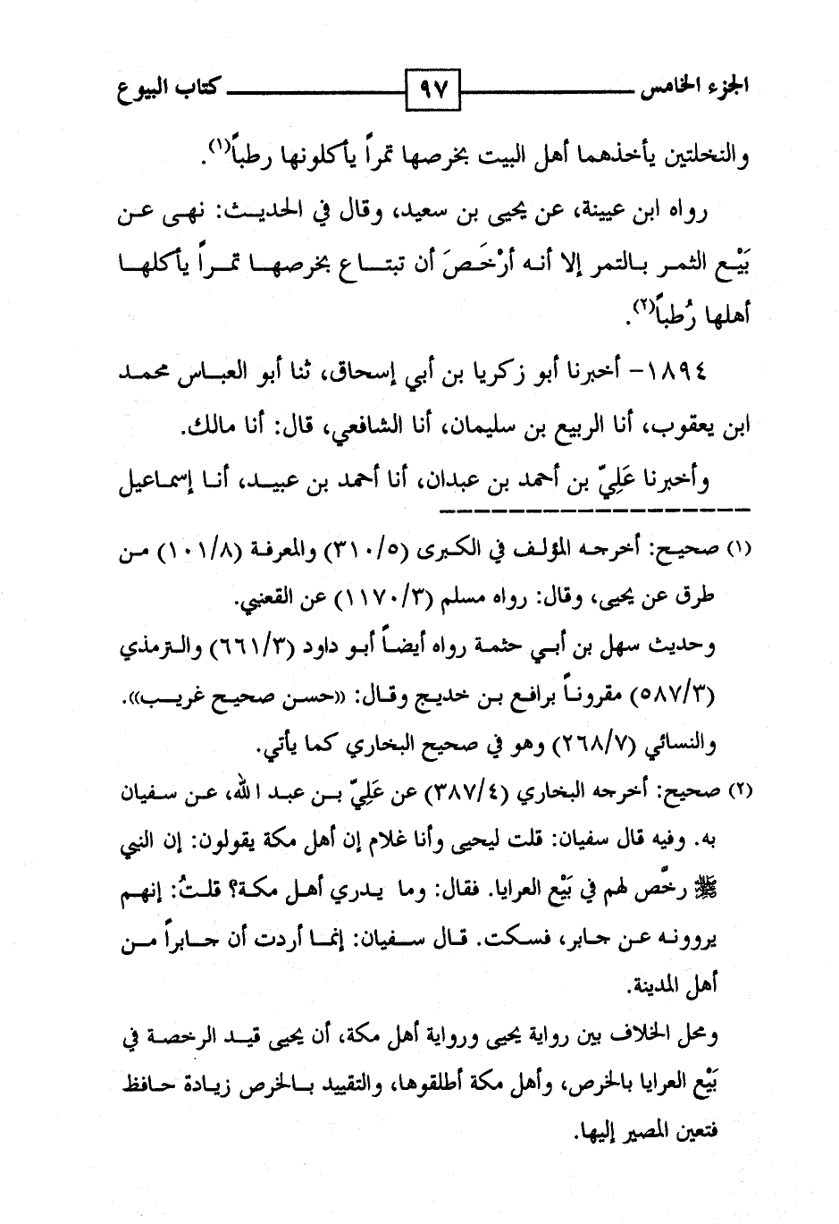 والنخلتين يأخذهما أهل البيت بخرصها تمراً يأكلونها رطباً ( 1 ) . رواه ابن عيينة ، عن يحيى بن سعيد ، وقال في الحديث : نهى عن بيع الثمر بالتمر إلا أنه أرخص أن تبتاع بخرصها تمراً يأكلها أهلها رطباً ( 2 ) .