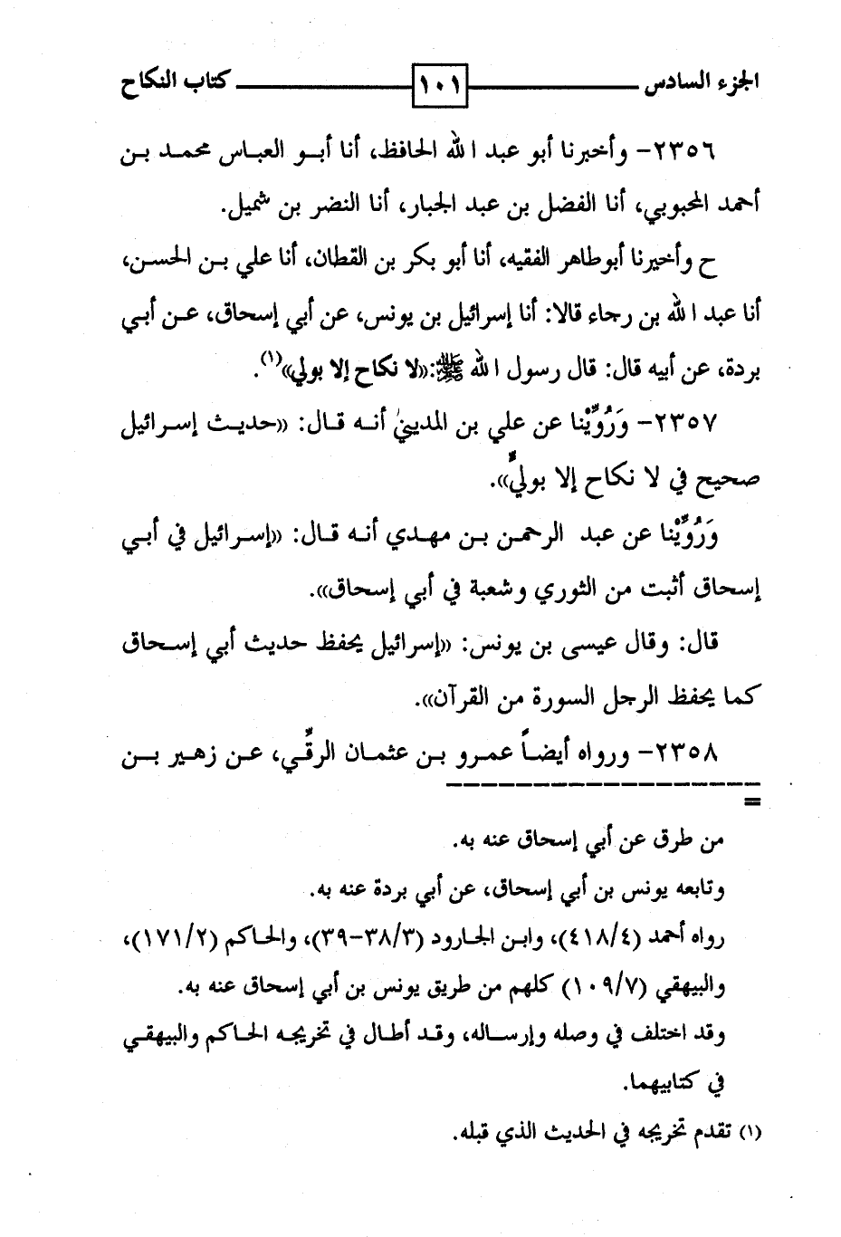 2356 - وأخبرنا أبو عبد الله الحافظ ، أنا أبو العباس محمد بن أحمد المحبوبي ، أنا الفضل بن عبد الجبار ، أنا النضر بن شميل . ح وأخبرنا أبو طاهر الفقيه ، أنا أبو بكر بن القطان ، أنا علي بن الحسن ، أنا عبد الله بن رجاء قالا : أنا إسرائيل بن يونس ، عن أبي اسحاق ، عن أبي بردة ، عن أبيه قال : قال رسول الله صلى الله عليه وسلم ' لا نكاح إلا بولي ' ( 1 ) .